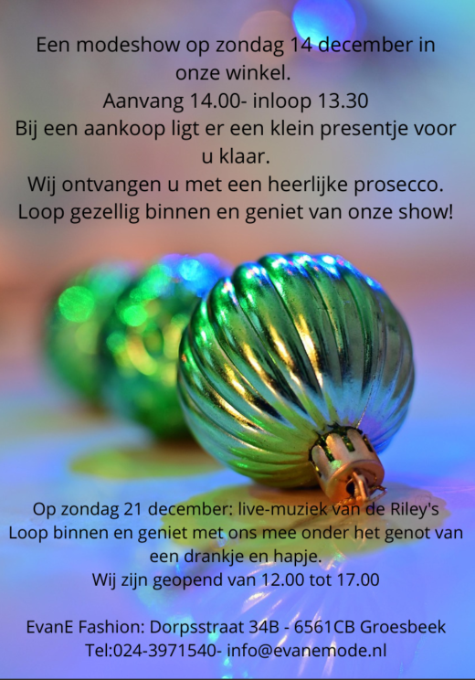 Onze modeshow komt er weer aan! Aanmelden kan in de winkel, per mail info@evanemode.nl of telefonisch via 024 397 1540 Tot dan!