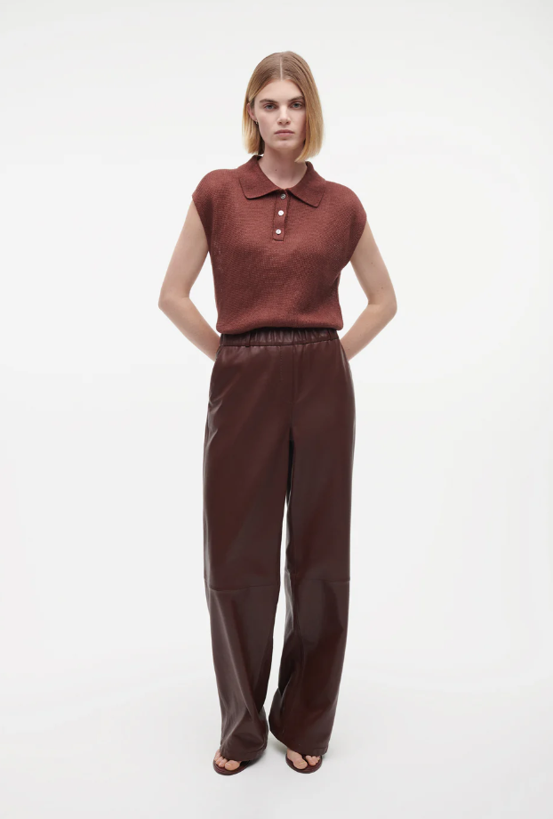 Materiaal: Leer / Polyester Kleur: Mahony Pasvorm: Wijd Bijzonderheden: Paspel zakken op de achterkant en verticale zakken op voorpand
