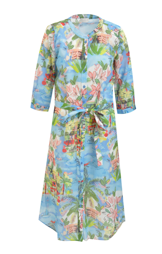 Materiaal: Katoen Kleur: Ocean print Pasvorm: Recht lange lengte Bijzonderheden: 3/4 mouw / onderkant splitten / met onderjurk en strik centeur / ocean motief